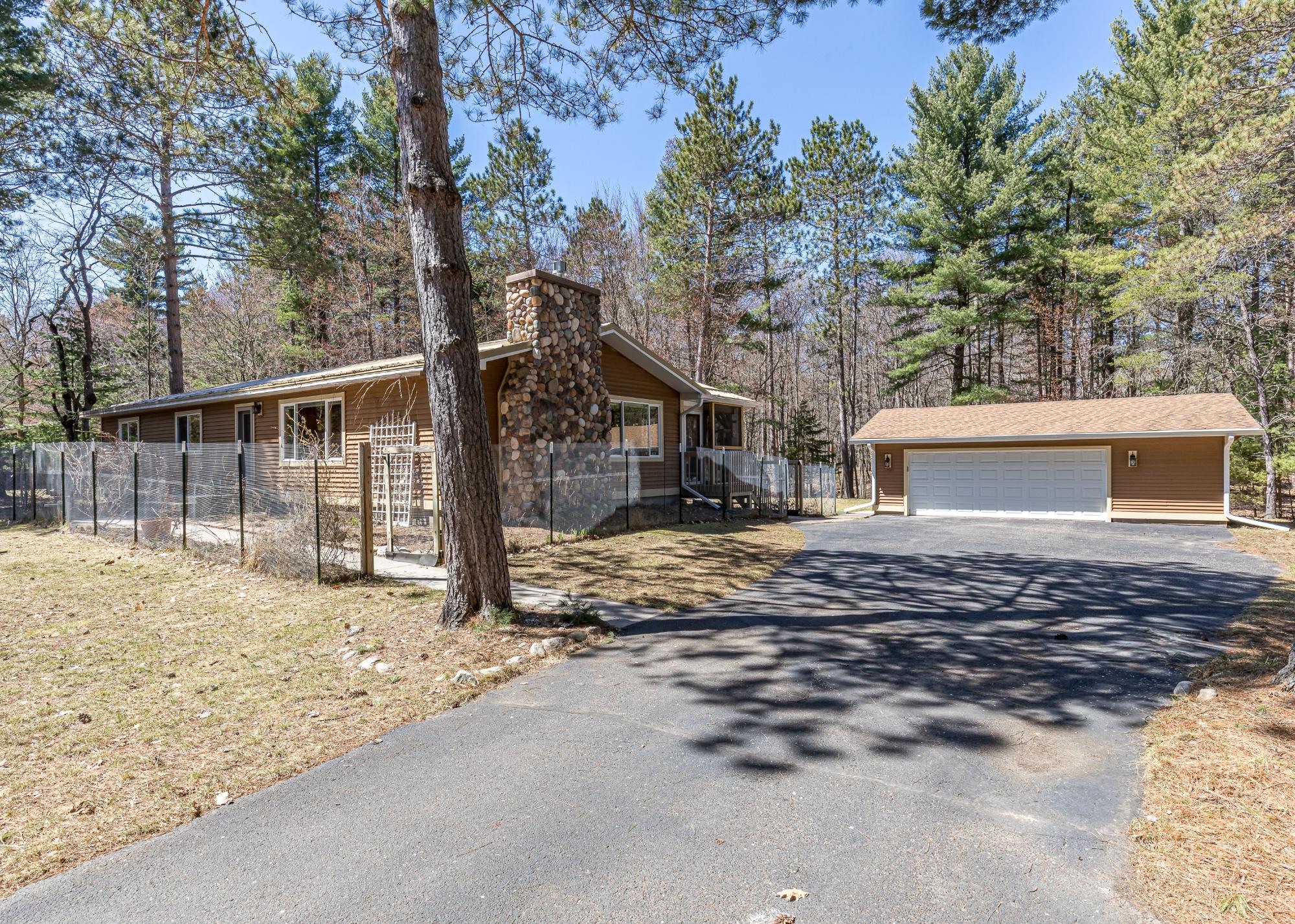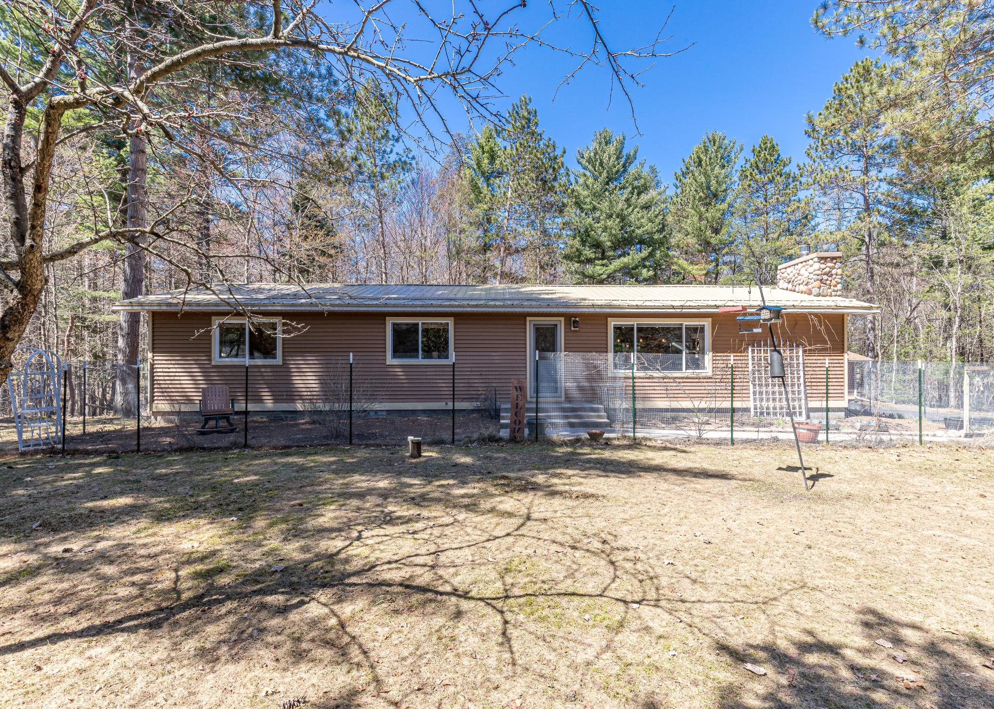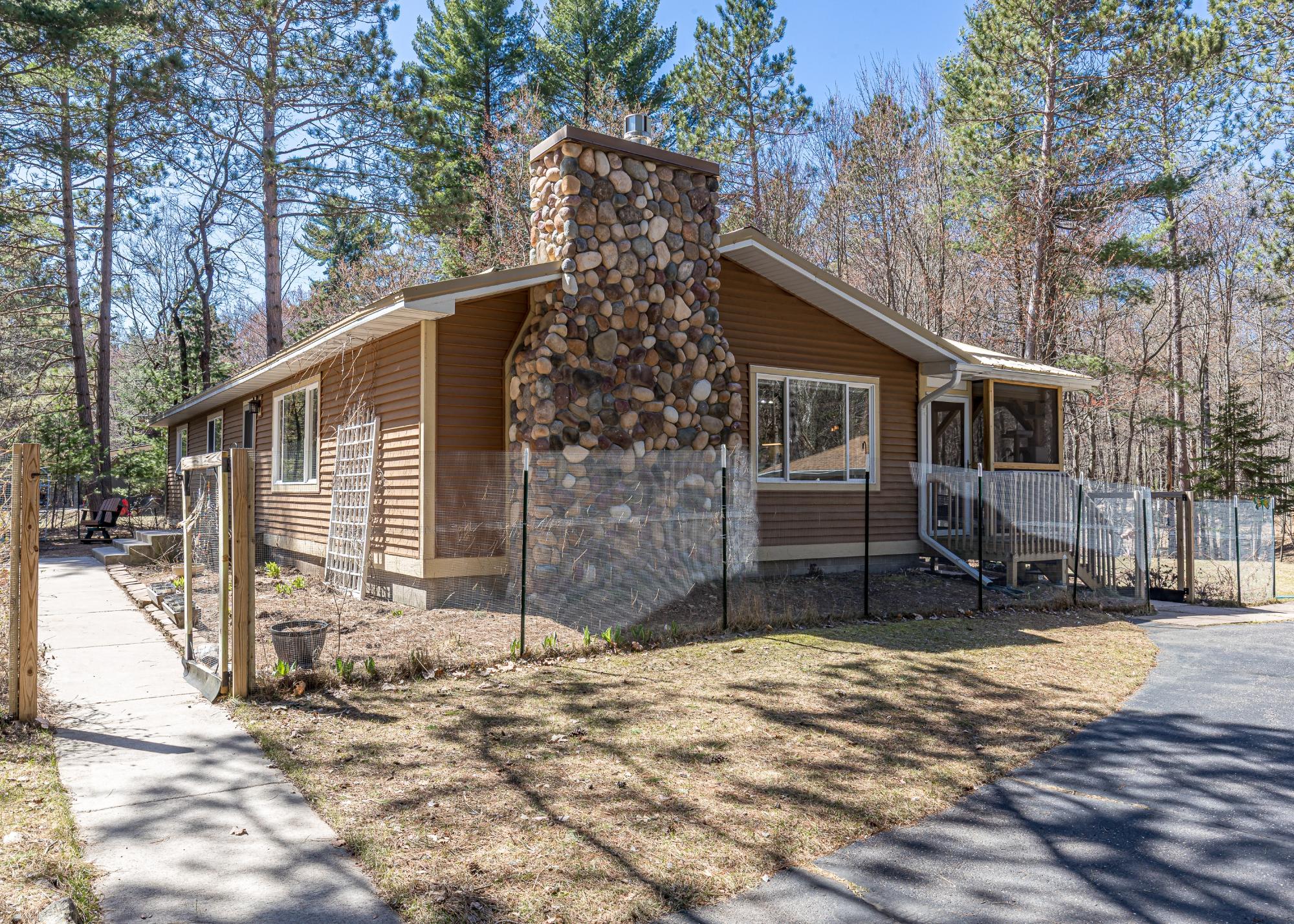 Here's a house with total Northwoods charm and is move in ready! In the past 6 years the interior has been completely remodeled and the exterior has new siding and a metal roof. In addition, the furnace, A/C unit and water heater were also replaced. This home offers one floor living, other than a few steps in the mudroom. The open concept living area is spacious and features a newer floor to ceiling gas fireplace in the living room and the kitchen has abundant granite countertops, ash cabinets and stainless steel appliances. There is also a dining area and a 16x9 screened porch to enjoy 3 seasons! Down the hallway you will find the laundry and three bedrooms, one of them being the primary with a private bathroom. There is a crawl space with exterior access. Step outside to a fenced area of fruit trees and bushes, a concrete walk way to the front door, blacktop driveway, oversized 2 car garage and a 1+ acre lot offering privacy. All of this is only minutes from town. It has been well cared for and is waiting for a new owner!