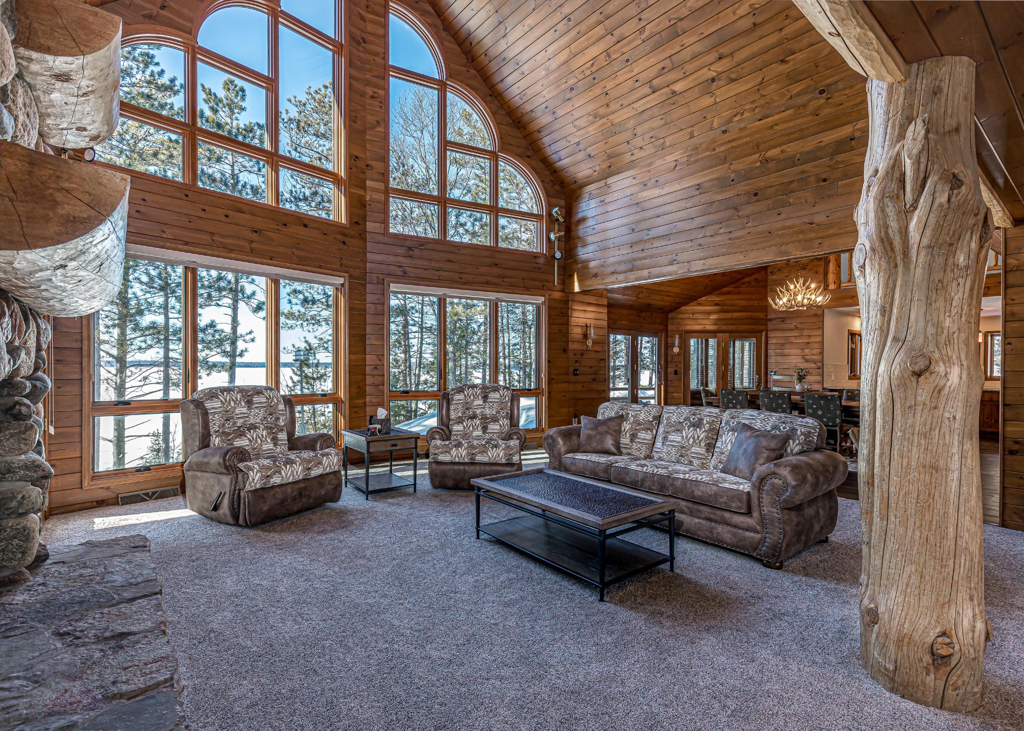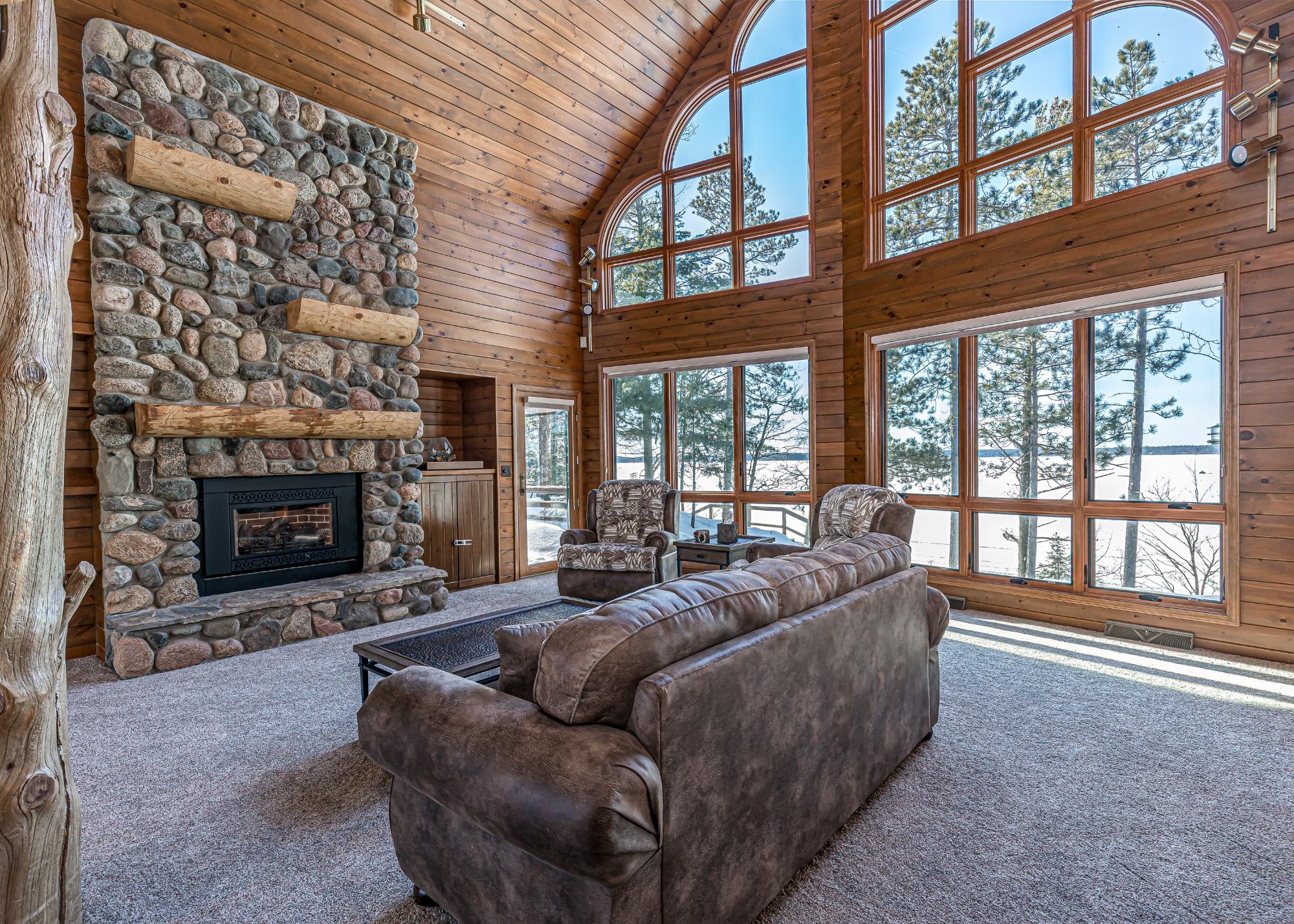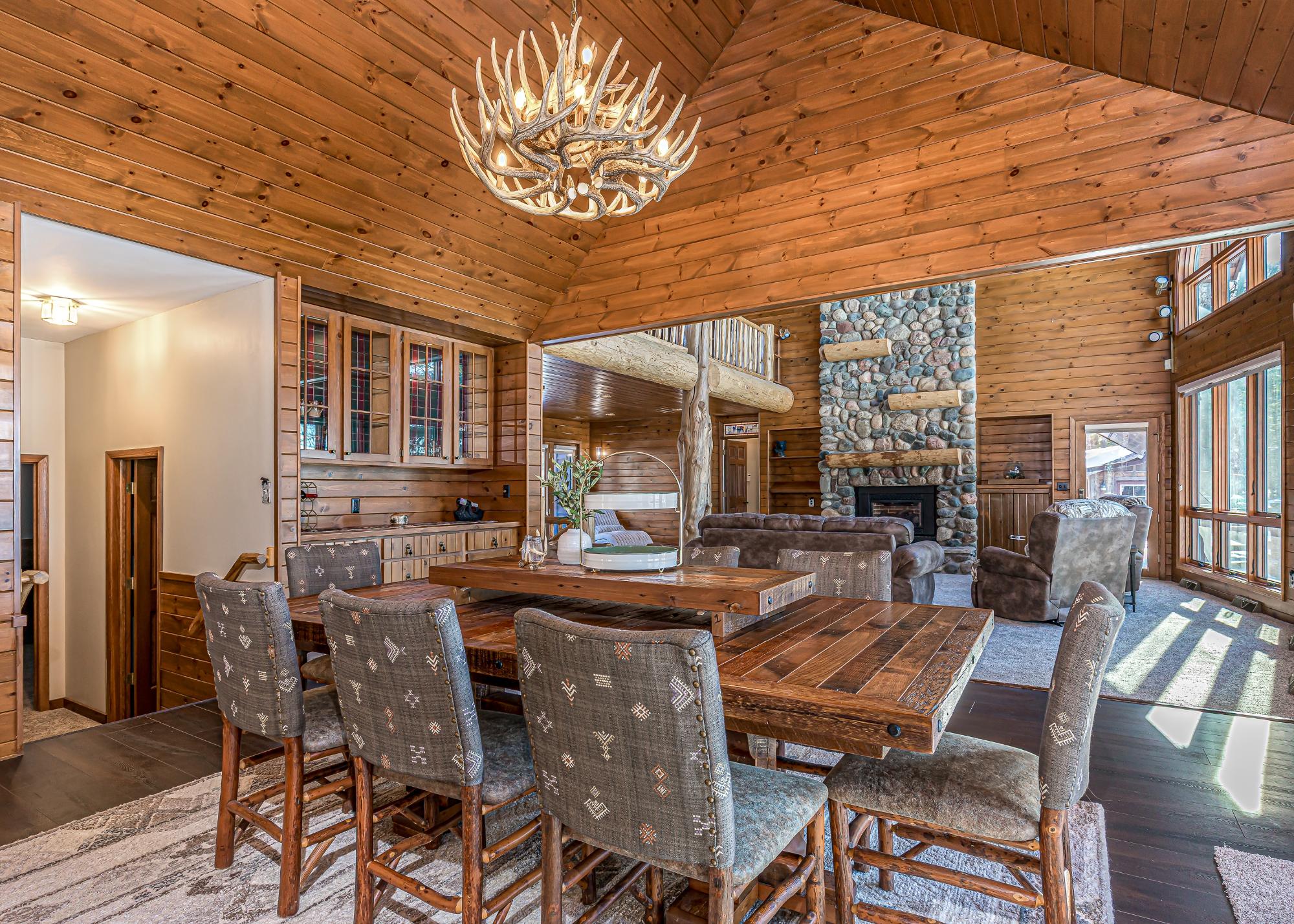 If you’re looking for big space, & big water, this home delivers. Set on 2 AC w/ 150’ of frtg on the 10-lake chain, it offers room for the whole family. The two-story living room features dramatic picture windows & a stunning fieldstone gas fireplace, creating the perfect gathering space. Log stairs lead to a loft ideal for an office or an extra sleeping area. The updated kitchen flows into the dining & living areas, ideal for entertaining, w/ an elevator for easy access between levels. A cozy media room sits just off the kitchen, w/ laundry tucked away & an additional loft for kids or guests. The lakeside 4-season sun porch is perfect for morning coffee. The main level includes a private guest bedroom and bath, plus a primary suite with fireplace, lakeside deck, luxury bath, and walk-in closet. The lower level offers a family room with wood-burning fireplace, wet bar, 3 bedrooms, and a full bath. Located on a quiet dead-end road, this extensively remodeled home is move in ready!